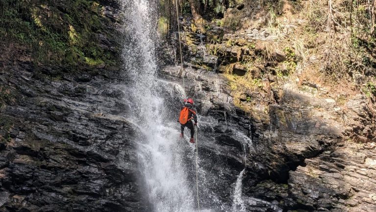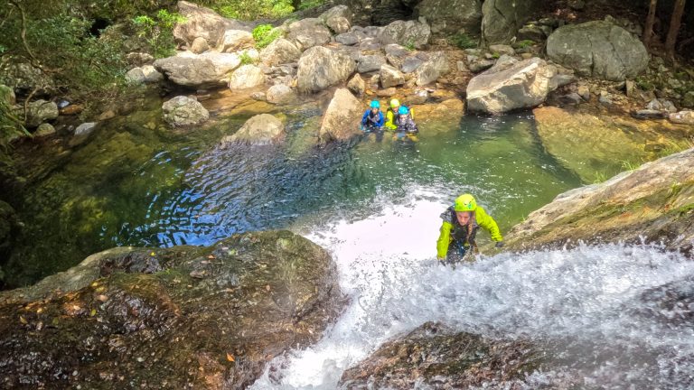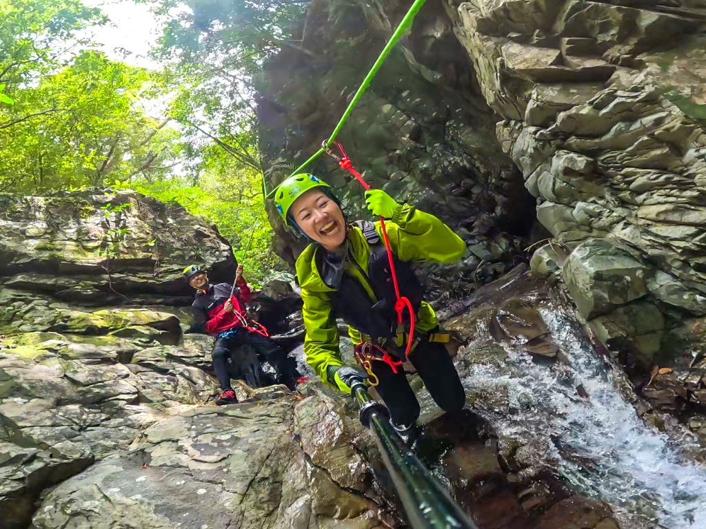 連続する滝登りにロープとアッセンダーを使った滝登攀、ディセンダーを使ったラぺリングなどが体験できるツアーです。